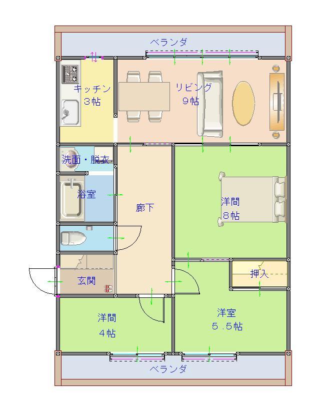 | 間取 | 3LDK (LD9帖、K3帖、洋室8帖、洋室5.5帖、洋室4帖) | ||