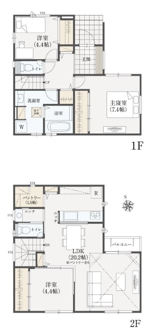 | 間取 | 3LDK + 2階LDK (LDK20.2帖、洋室4.4帖、洋室7.4帖、洋室4.4帖) | ||