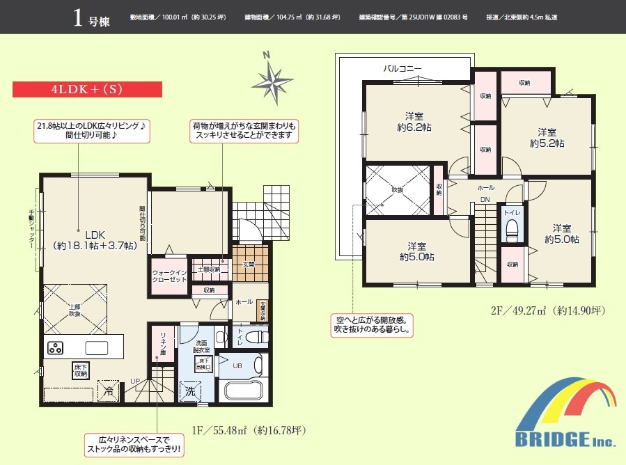 | 間取 | 4LDK + 土間収納・リネン庫・ホール収納・WIC付き (LDK21.8帖、洋室6.2帖、洋室5.2帖、洋室5帖、洋室5帖) | ||