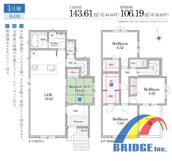 | 間取 | 4LDK + ファミクロ、2WIC付き (LDK19帖、和室4.5帖、洋室7帖、洋室6.5帖、洋室5.2帖) | ||