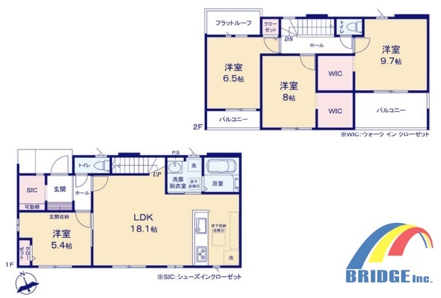 | 間取 | 4LDK + 土間収納・納戸・WIC2つ付き (LDK18.1帖、洋室9.7帖、洋室8帖、洋室6.5帖、洋室5.4帖) | ||