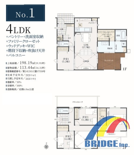 | 間取 | 4LDK + 階段下収納、パントリー、ファミクロ、WIC付き (LDK17.7帖、洋室5.2帖、洋室7.7帖、洋室5.2帖、洋室4.4帖) | ||