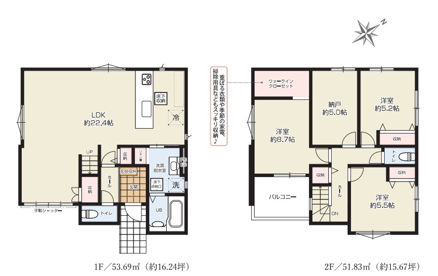 | 間取 | 3SLDK + リビング収納・リネンスペース・WIC付き (LDK22.4帖、洋室8.7帖、洋室5.5帖、洋室5.2帖、S5帖) | ||