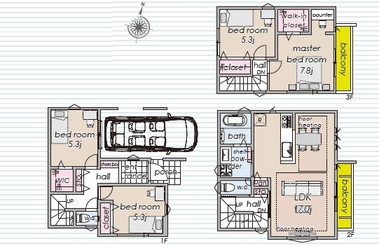 | 間取 | 4LDK + WIC、ホール収納付き、スタディカウンター (LDK17帖、洋室7.8帖、洋室5.3帖、洋室5.3帖、洋室5.3帖) | ||