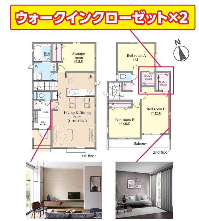 | 間取 | 4LDK + 2WIC、全居室収納付き (LDK17.5帖、洋室7.12帖、洋室6.06帖、洋室6帖、洋室5.5帖) | ||