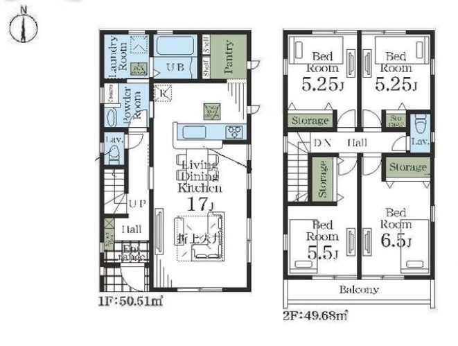 | 間取 | 4LDK + WIC、ホール収納付き、パントリー (LDK17帖、洋室6.5帖、洋室5.5帖、洋室5.25帖、洋室5.25帖) | ||