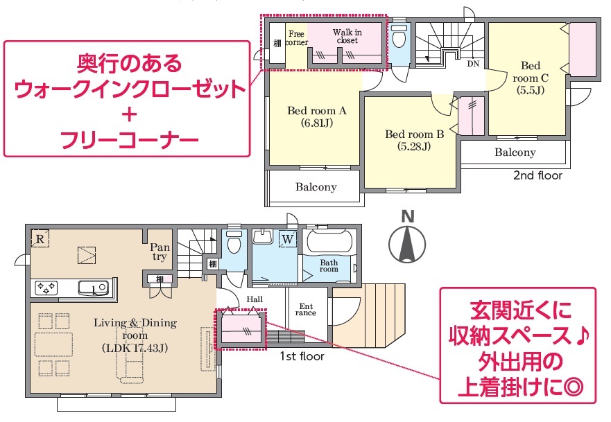| 間取 | 3LDK + ホール収納・WIC (LDK17.43帖、洋室6.8帖、洋室5.5帖、洋室5.28帖) | ||