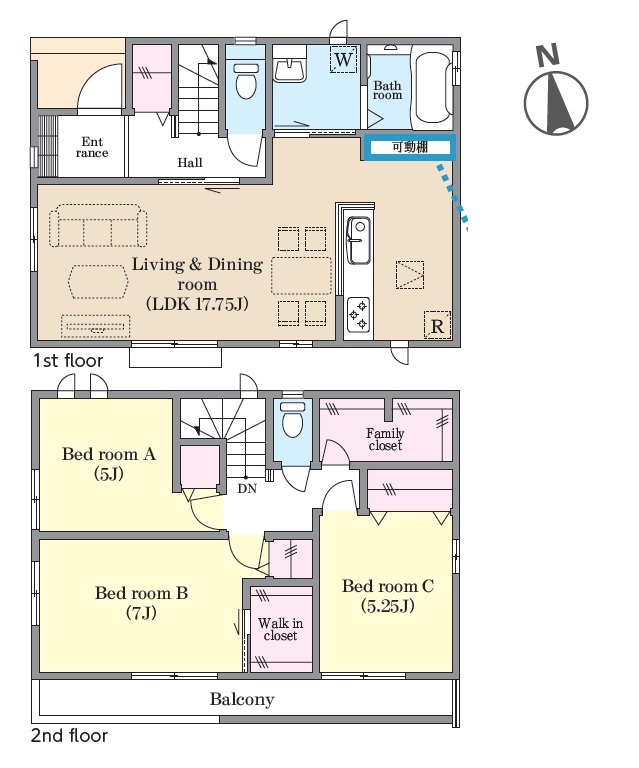 | 間取 | 3LDK + ホール収納・WIC、ファミリークローク付き (LDK17.75帖、洋室7帖、洋室5.25帖、洋室5帖) | ||