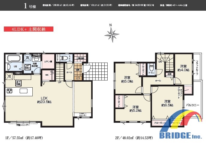 | 間取 | 4LDK + リネン庫、土間収納、WIC、2階ホール収納付き (LDK23.5帖、洋室6.5帖、洋室5.2帖、洋室5帖、洋室4帖) | ||