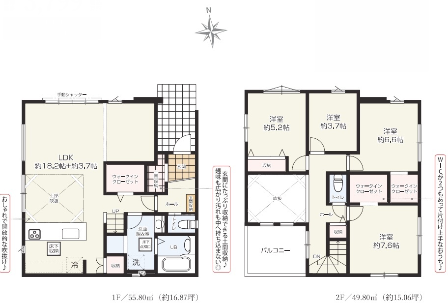 | 間取 | 4LDK + キッチン収納、リネン庫、土間収納付き (LDK21.9帖、洋室7.6帖、洋室6.6帖、洋室5.2帖、洋室3.7帖) | ||
