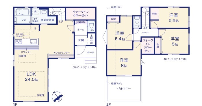 | 間取 | 4LDK + 2WIC、床暖房付き (LDK24.5帖、洋室8帖、洋室5.6帖、洋室5.4帖、洋室5帖) | ||