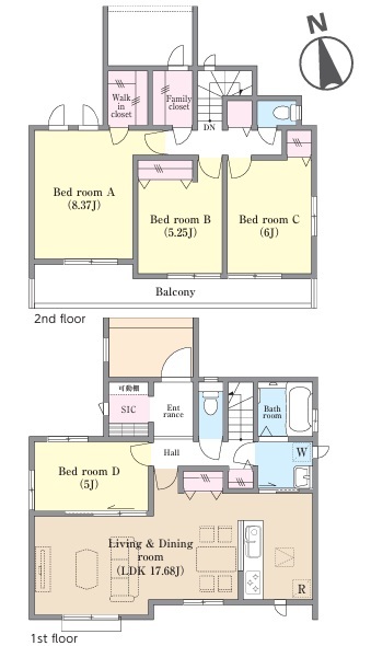 | 間取 | 4LDK + WIC、ファミリークローク、SIC (LDK17.68帖、洋室5帖、洋室8.37帖、洋室6帖、洋室5.25帖) | ||