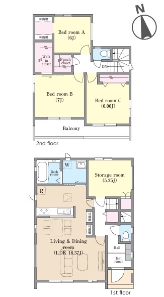 | 間取 | 3SLDK + WIC、ファミリークローク (LDK18.37帖、SLDK5.25帖、洋室6.06帖、洋室7帖、洋室6帖) | ||