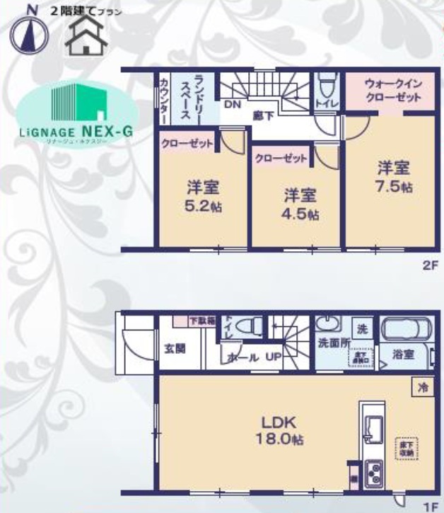 | 間取 | 3LDK + ランドリースペース付き (LDK18帖、洋室7.5帖、洋室5.2帖、洋室4.5帖) | ||