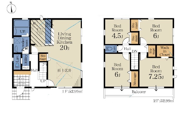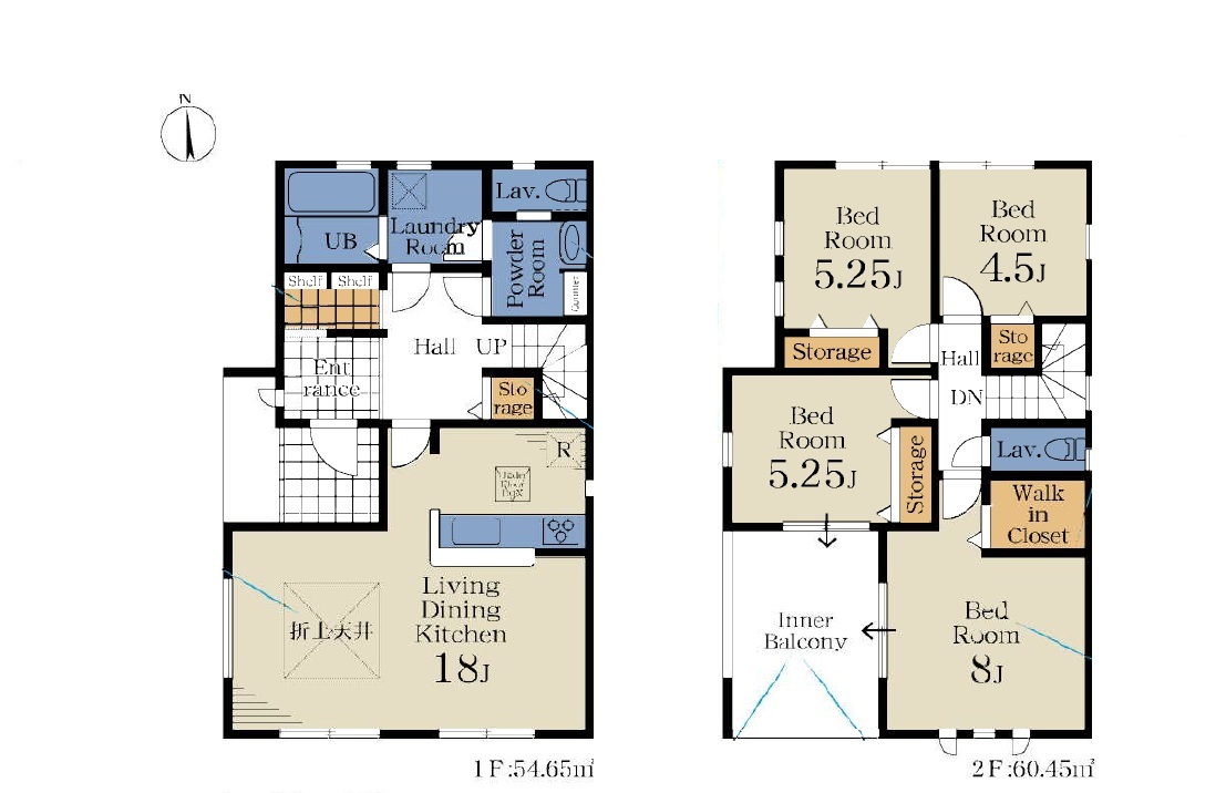 | 間取 | 4LDK~4SLDK + ランドリースペース、WIC付き (LDK18帖、洋室8帖、洋室5.25帖、洋室5.25帖、洋室4.5帖) | ||