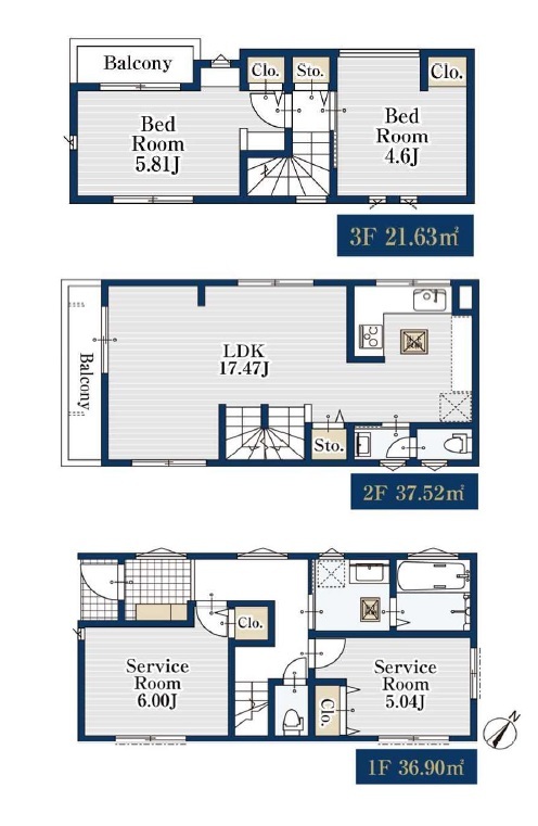 | 間取 | 2SLDK + 全居室収納付き (LDK17.47帖、洋室5.81帖、洋室4.6帖、S6帖、S5.04帖) | ||