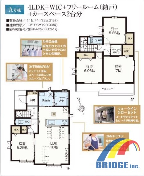 | 間取 | 4LDK + ホール収納、WIC付き (LDK16帖、洋室5.25帖、洋室7帖、洋室6.06帖、洋室5.25帖) | ||