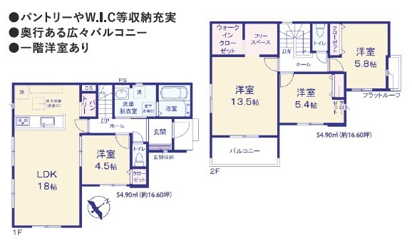 | 間取 | 4LDK (LDK18帖、洋室4.5帖、洋室13.5帖、洋室5.8帖、洋室5.4帖) | ||