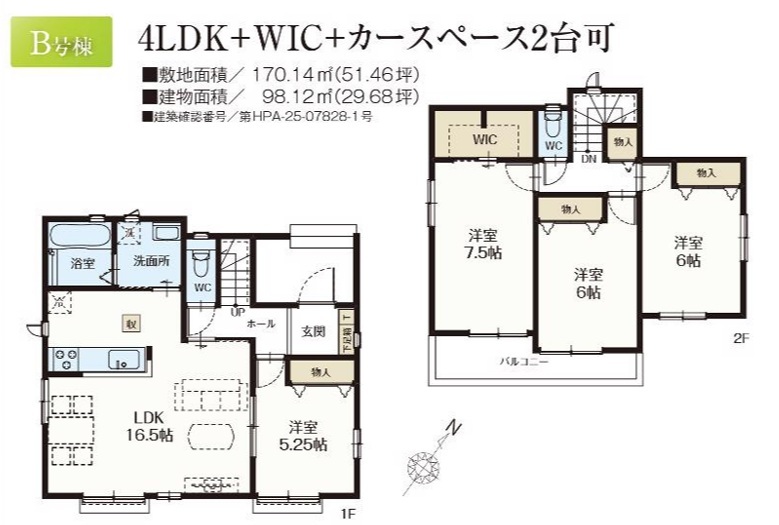 | 間取 | 4LDK + WIC、全居室収納付き、ホール収納 (LDK16.5帖、洋室7.5帖、洋室6帖、洋室6帖、洋室5.25帖) | ||