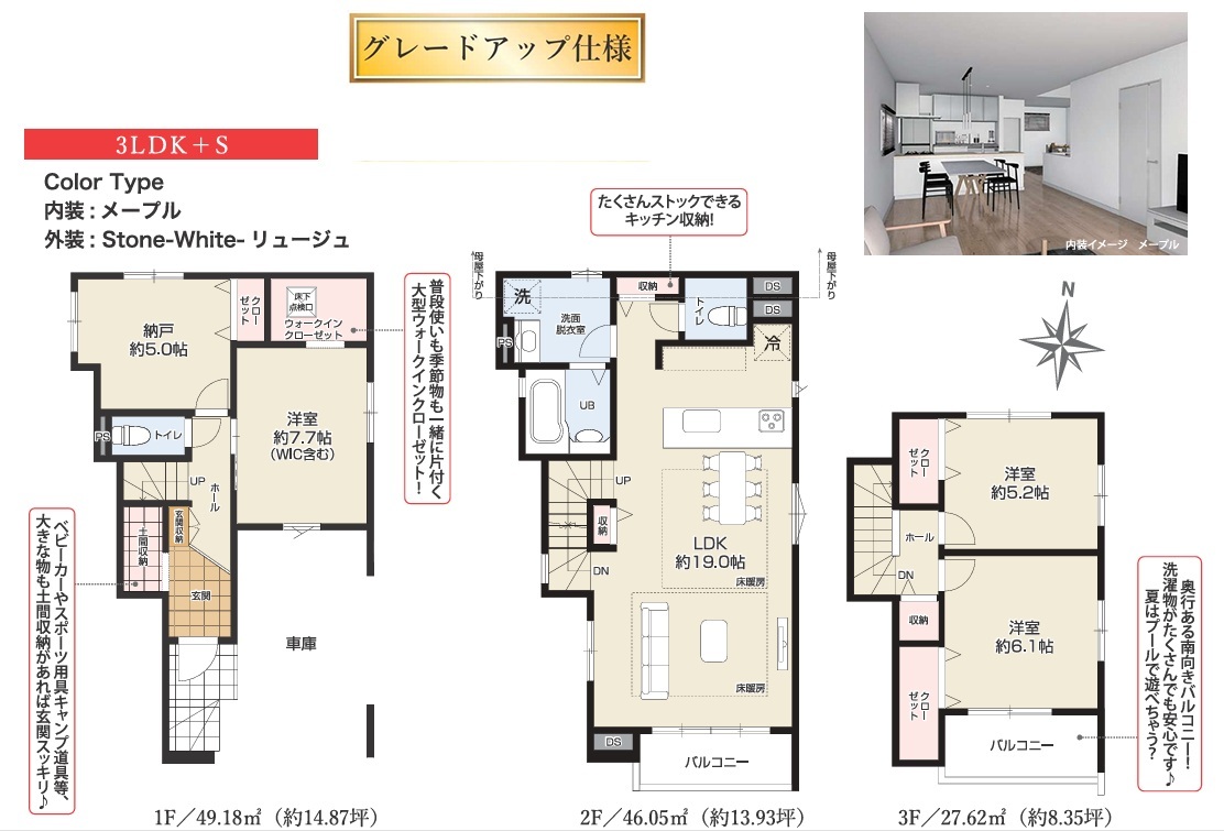 | 間取 | 3SLDK + 駐車場1台・土間収納・WIC・キッチン収納・床暖房 (LDK19.0帖、洋室7.7帖、洋室6.1帖、洋室5.2帖、S5帖) | ||
