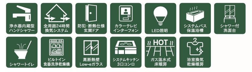 整形地平坦地緑豊かな住宅地閑静な住宅地地盤調査済LDK15帖以上耐震構造デザイナーズハウス南向き全室2面採光全居室収納吹抜けワイドバルコニー複層ガラス耐震適合床暖房浄水器省エネ給湯器ガスコンロシステムキッチンカウンターキッチン3口以上コンロトイレ2ヶ所温水洗浄便座シャワー付洗面台浴室乾燥機浴室暖房追焚機能浴室1坪以上オートバス全居室フローリングリビング階段バリアフリー仕様TVモニタ付インターホンノンホルムアルデヒド24時間換気システム保育園・幼稚園800m以内陽当り良好通風良好フラット35Sに対応フラット35・S適合証明書