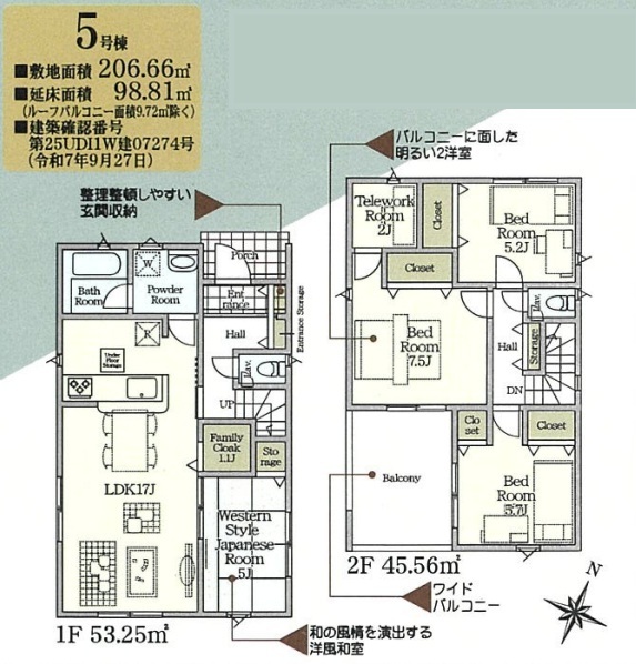 | 間取 | 4SLDK + 駐車1台・和室・テレワークルーム・ワイドバルコニー (LDK17帖、和室5帖、洋室7.5帖、洋室5.7帖、洋室5.2帖、S2帖) | ||