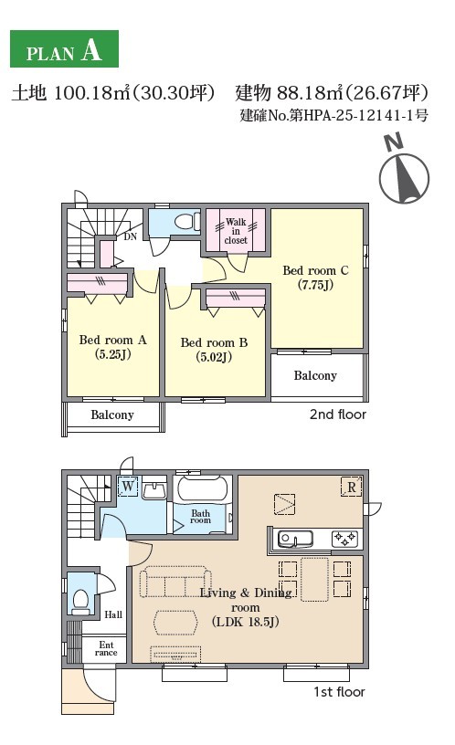 | 間取 | 3LDK~3LDK + WIC、2階ホール収納、2面バルコニー付き (LDK18.5帖、洋室7.75帖、洋室5.25帖、洋室5.02帖) | ||