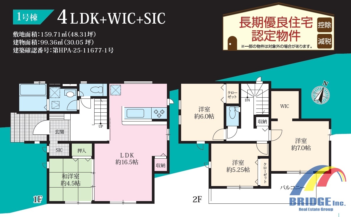 | 間取 | 4LDK + リビング収納・WIC付き、二階ホール収納付き (LDK16.5帖、和室4.5帖、洋室7帖、洋室6帖、洋室5.25帖) | ||
