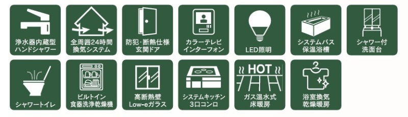 整形地平坦地緑豊かな住宅地閑静な住宅地地盤調査済LDK15帖以上耐震構造デザイナーズハウス南向き全室2面採光床下収納全居室収納2面以上バルコニー複層ガラス耐震適合床暖房食器洗浄機浄水器省エネ給湯器ガスコンロシステムキッチンカウンターキッチン3口以上コンロパントリー(食器・食品の収納庫)トイレ2ヶ所温水洗浄便座シャワー付洗面台浴室乾燥機浴室暖房追焚機能浴室1坪以上浴室に窓オートバス全居室フローリングリビング階段ウォークインクローゼットバリアフリー仕様TVモニタ付インターホンビルトガレージノンホルムアルデヒド24時間換気システム保育園・幼稚園800m以内公園800m以内陽当り良好通風良好フラット35Sに対応フラット35・S適合証明書