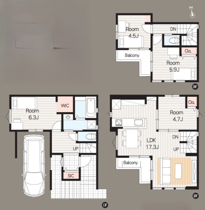 | 間取 | 4LDK + 床暖房付き (LDK17.3帖、洋室6.3帖、洋室4.7帖、洋室4.5帖、洋室5.9帖) | ||