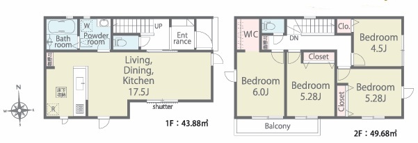 | 間取 | 4LDK (LDK17.5帖、洋室6.0帖、洋室5.28帖、洋室5.28帖、洋室4.5帖) | ||