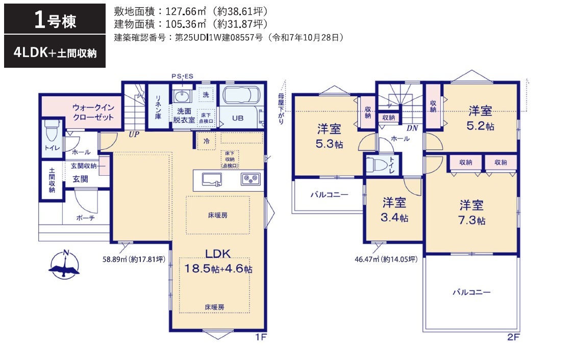| 間取 | 4LDK + リネン庫・ホール収納・WIC付き・土間収納 (LDK23.1帖、洋室7.3帖、洋室5.3帖、洋室5.2帖、洋室3.4帖) | ||