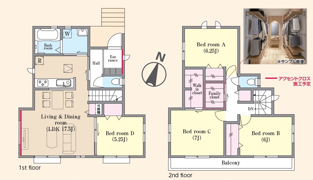 | 間取 | 4LDK + WIC、ファミリークローク付き (LDK17.5帖、洋室5.25帖、洋室7帖、洋室6帖、洋室6.25帖) | ||