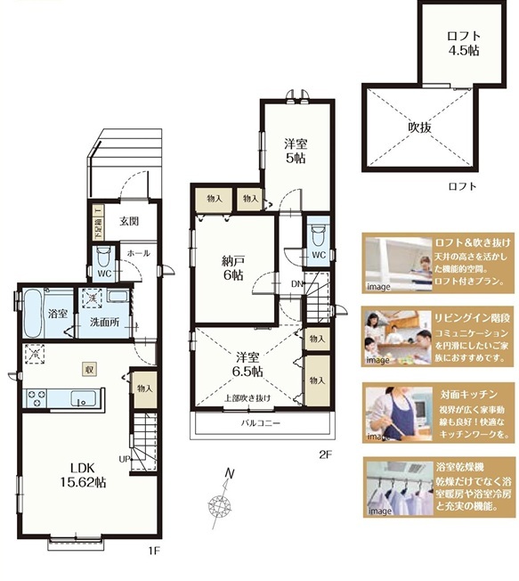 | 間取 | 2SLDK + 納戸、ロフト (LDK15.62帖、洋室6.5帖、洋室5帖、S6帖) | ||