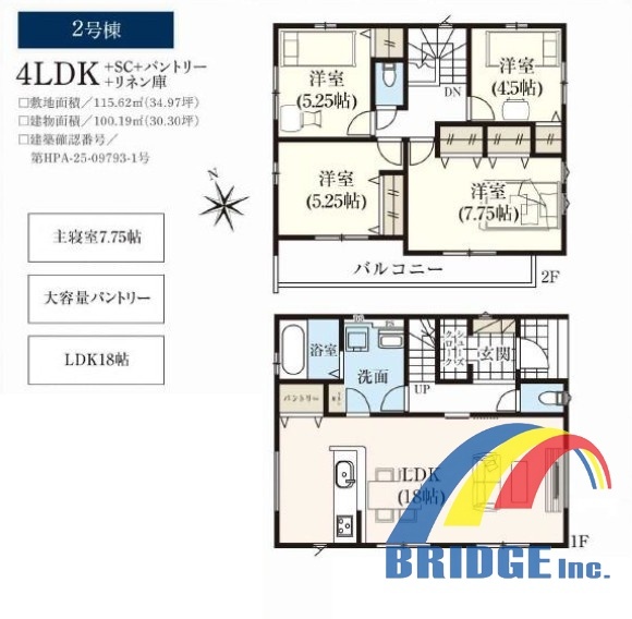 | 間取 | 4LDK + パントリー、リネン庫、SC付き (LDK18帖、洋室7.75帖、洋室5.25帖、洋室5.25帖、洋室4.5帖) | ||
