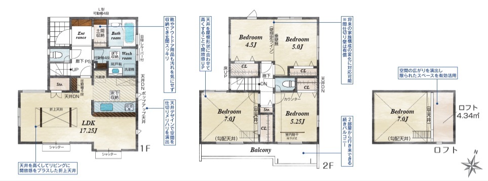 | 間取 | 4LDK + ロフト付き (LDK17.25帖、洋室7帖、洋室5.25帖、洋室5.0帖、洋室4.5帖) | ||