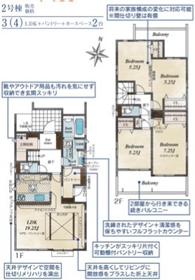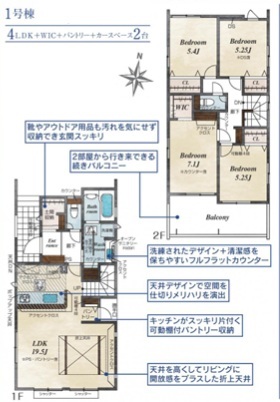 | 間取 | 4LDK~4LDK + W.I.C、パントリー、駐車2台可能 (LDK19.5帖、洋室7.1帖、洋室5.4帖、洋室5.25帖、洋室5.25帖) | ||