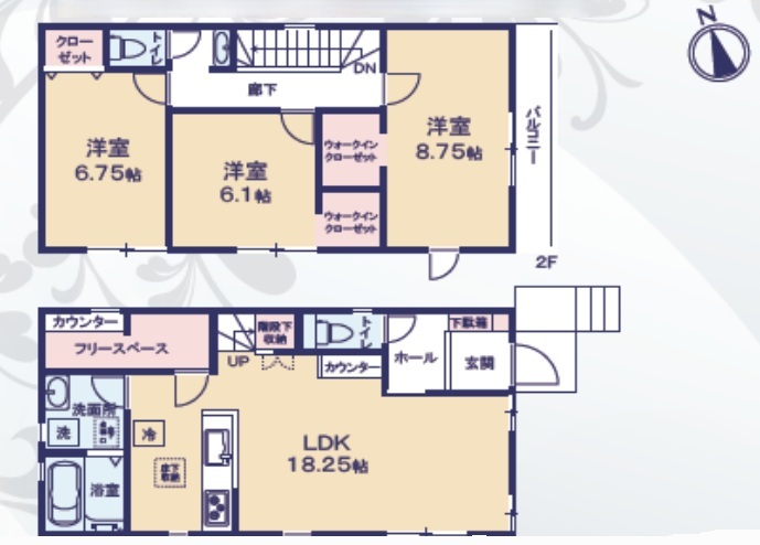| 間取 | 3LDK~4LDK + フリースペース、階段下収納 (LDK18.25帖、洋室8.75帖、洋室6.75帖、洋室6.1帖) | ||