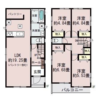 | 間取 | 4LDK (LDK19.25帖、洋室6.68帖、洋室5.53帖、洋室4.84帖、洋室4.84帖) | ||