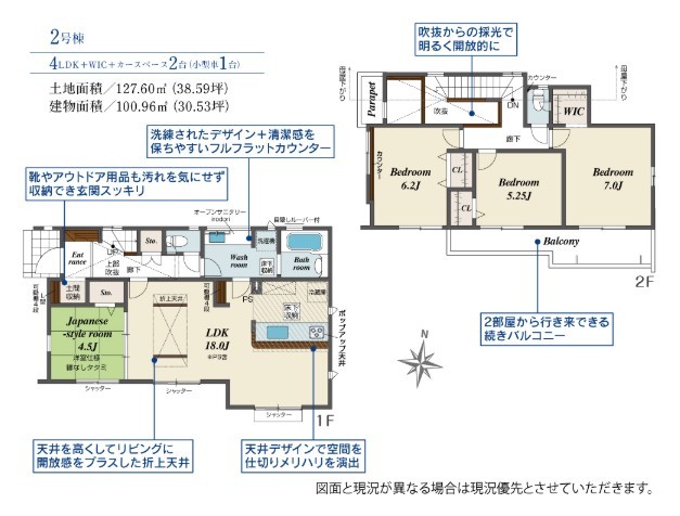 | 間取 | 4LDK + 階段下収納、土間収納、WIC付き (LDK18帖、和室4.5帖、洋室7帖、洋室6.2帖、洋室5.25帖) | ||