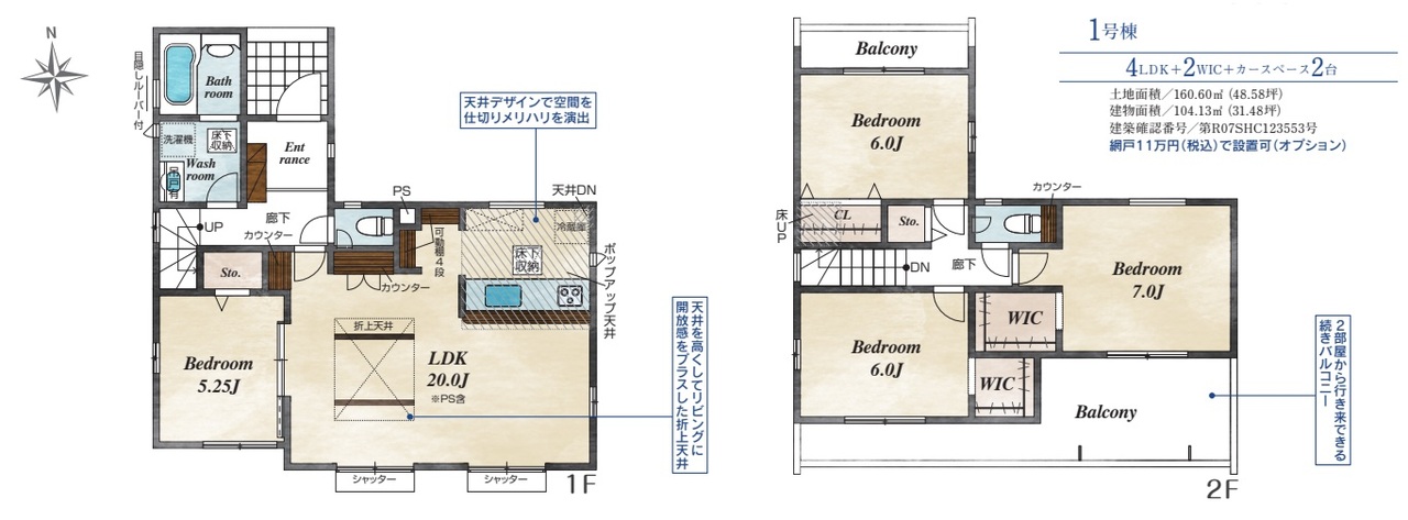 | 間取 | 4LDK + 折上天井・WIC・洗面吊戸棚・リビング可動棚・2面バルコニー (LDK20帖、洋室7帖、洋室6帖、洋室6帖、洋室5.25帖) | ||