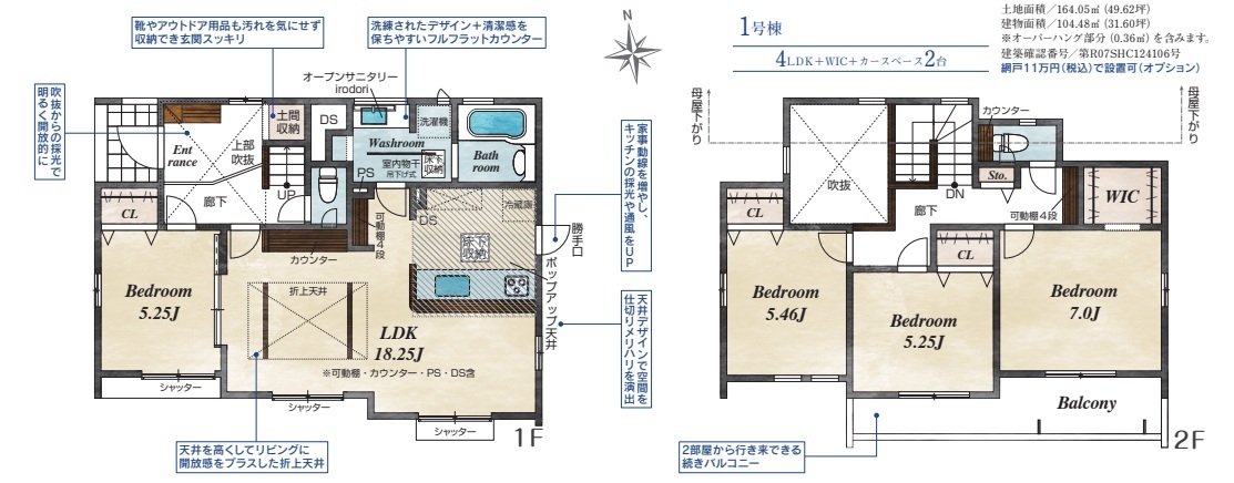 | 間取 | 4LDK + 吹抜・土間収納・可動棚・WIC・2階ホール収納・カウンター (LDK18.25帖、洋室7帖、洋室5.46帖、洋室5.25帖、洋室5.25帖) | ||