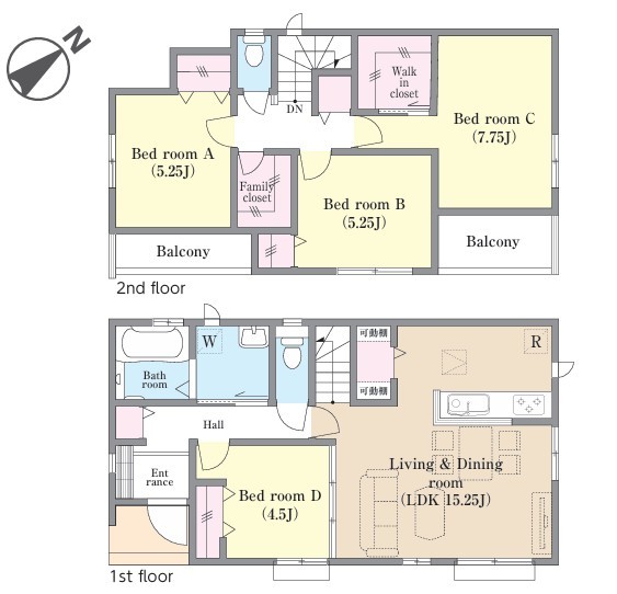 | 間取 | 4LDK + WIC、Fクロ、キッチン収納、2面バルコニー (LDK15.25帖、洋室4.5帖、洋室7.75帖、洋室5.25帖、洋室5.25帖) | ||