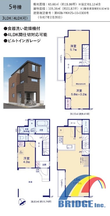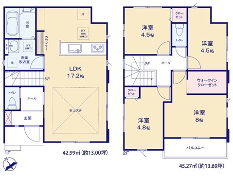 | 間取 | 3SLDK~4LDK + カウンター、リビング階段、WIC (LDK17.2帖、洋室8帖、洋室4.8帖、洋室4.5帖、洋室4.5帖) | ||