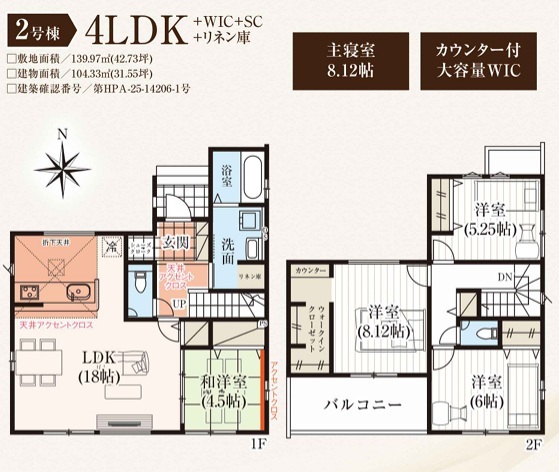 | 間取 | 4LDK~4LDK + W.I.C、リネン庫 (LDK17.5帖、和室6.12帖、洋室6帖、洋室5.25帖、洋室4.37帖) | ||
