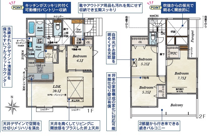 | 間取 | 3LDK~4LDK + 玄関吹き抜け、リビング収納、土間収納付き (LDK17.75帖、洋室5.25帖、洋室7.12帖、洋室5.25帖、洋室5.25帖) | ||