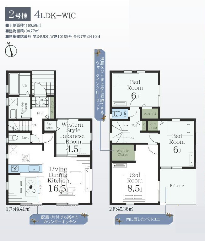 | 間取 | 3LDK + WIC、2階ホール収納 (LDK16.5帖、和室4.5帖、洋室8.5帖、洋室6帖、洋室6帖) | ||