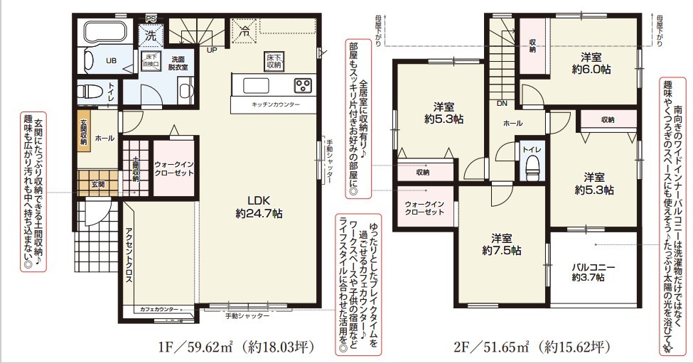 | 間取 | 4SLDK + 土間収納・WIC・バルコニー3.7帖・カフェカウンター (LDK24.7帖、洋室7.5帖、洋室6帖、洋室5.3帖、洋室5.3帖) | ||