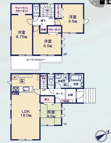 | 間取 | 4LDK + 収納豊富 (LDK18帖、和室4.5帖、洋室8.75帖、洋室6.5帖、洋室6.5帖) | ||