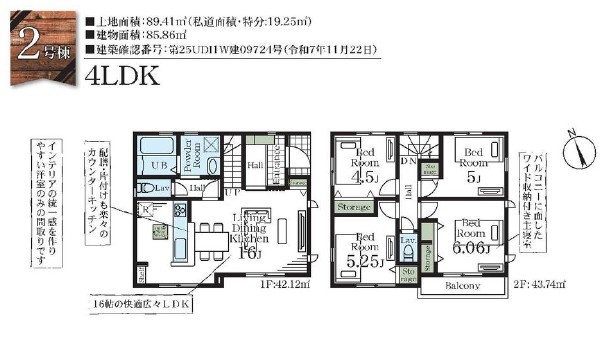 | 間取 | 4LDK + リビング階段・リビング収納 (LDK16帖、洋室6.06帖、洋室5.25帖、洋室5帖、洋室4.5帖) | ||